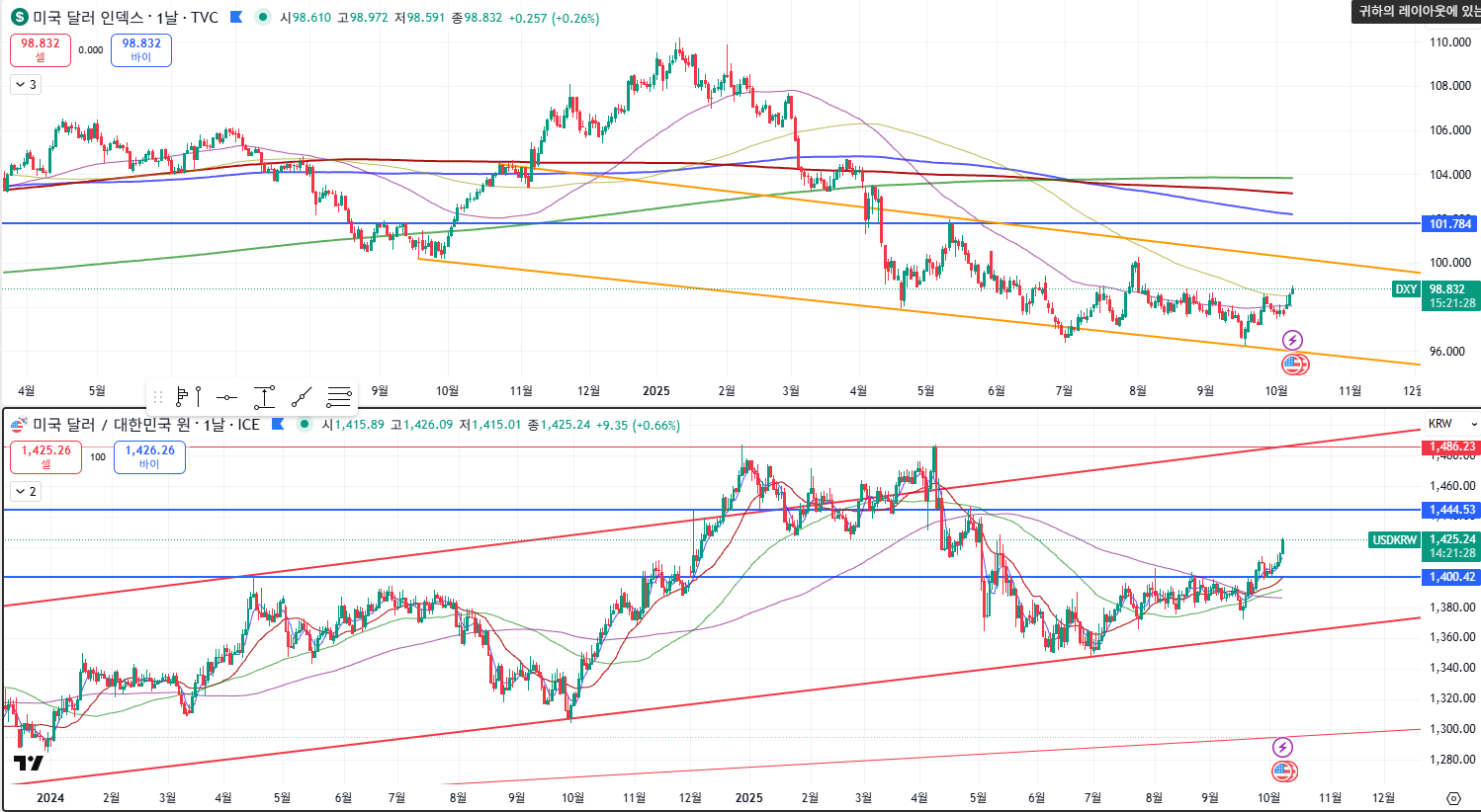 달러가 내려가고 있는 와중에도, 우리나라 돈으로 본 달러는 계속 비싸지고 있음. 먼저 소비쿠폰의 영향이 없을 수는 없음.