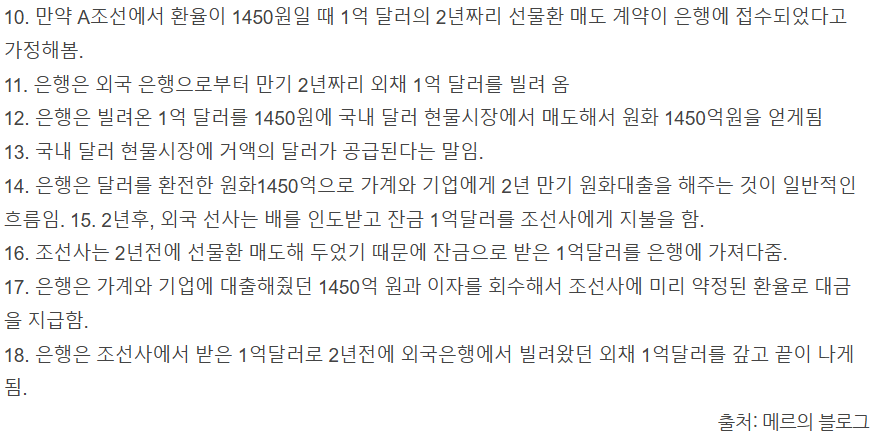 리스크3 : 조선사 선물환매도 수주방식, 달러 매도 폭탄 , 아래 블로거 '메르'님 글 참고. ->