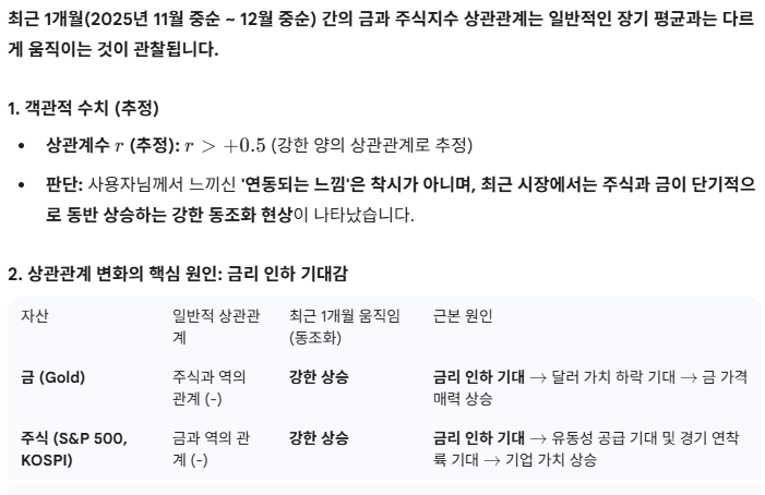 위가 일반적인 금과 주식과의 관계인데 보통은 둘의 가격은 서로 독립적으로 움직이거나 주식 하락장에는 금이 강세를 보이는 경우가 많은데 지금 한달간 금의 포지션은 서로의 상승 모멘텀이 공통분모인 '미국 금리인하'에 의해 움직이는 경향성이 강함.